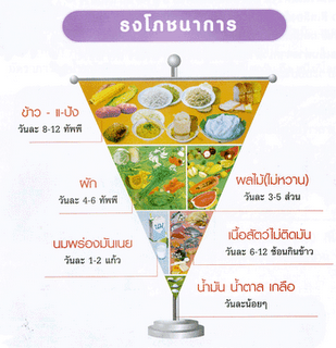 ธงโภชนาการ คือ เครื่องมือที่ช่วยอธิบายและทำความเข้าใจโภชนบัญญัติ ๙ ประการ เพื่อนำไปสู่การปฏิบัติโดยกำหนดเป็น ภาพ"ธงปลายแหลม"แสดงกลุ่มอาหารและสัดส่วนการกินอาหารในแต่ละกลุ่มมากน้อยตาม พื้นที่สังเกตุได้ชัดเจนว่าฐานใหญ่ด้านบนเน้นให้กินมากและปลายธง ข้างล่างบอกให้กินน้อย ๆ เท่าที่จำเป็น